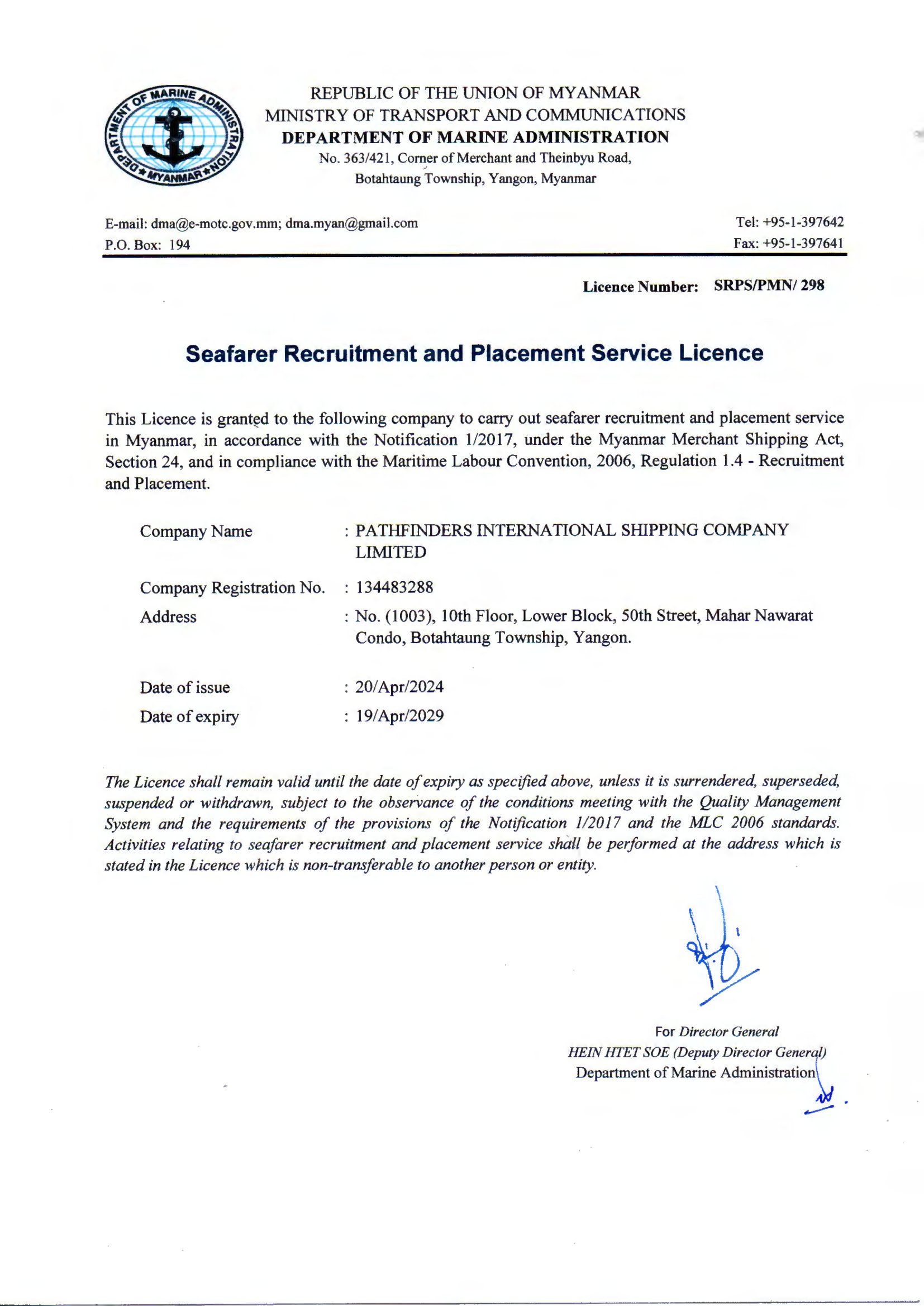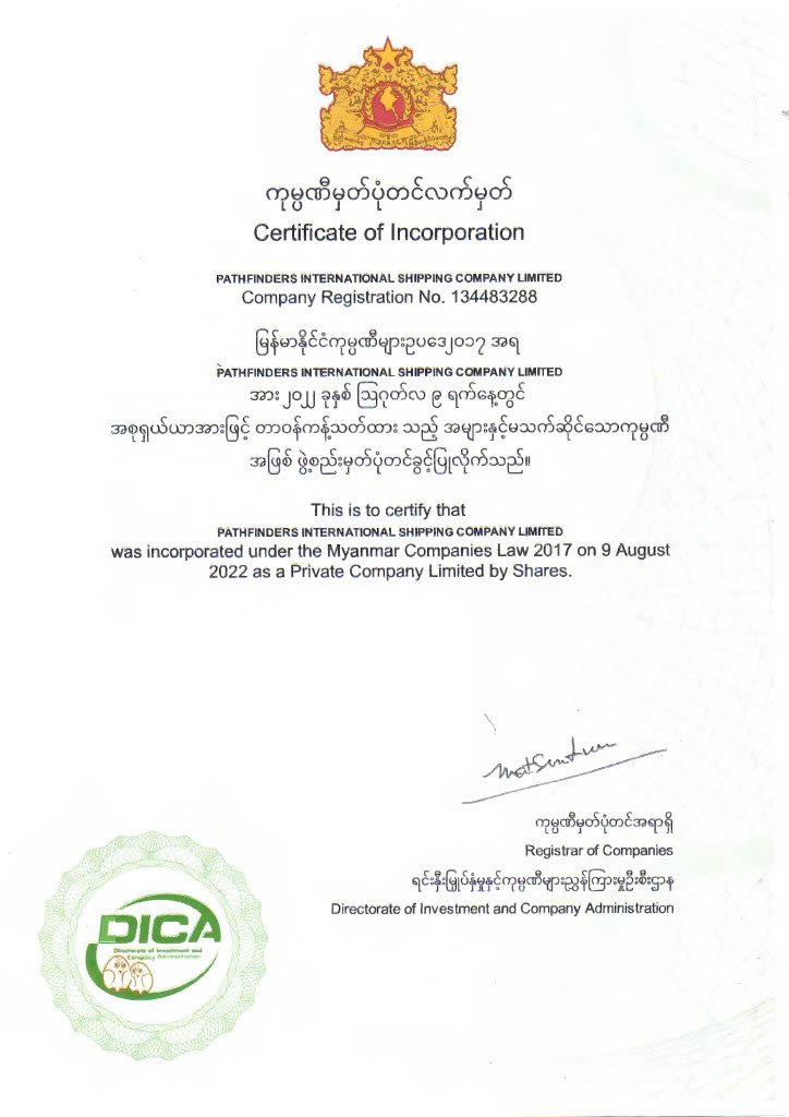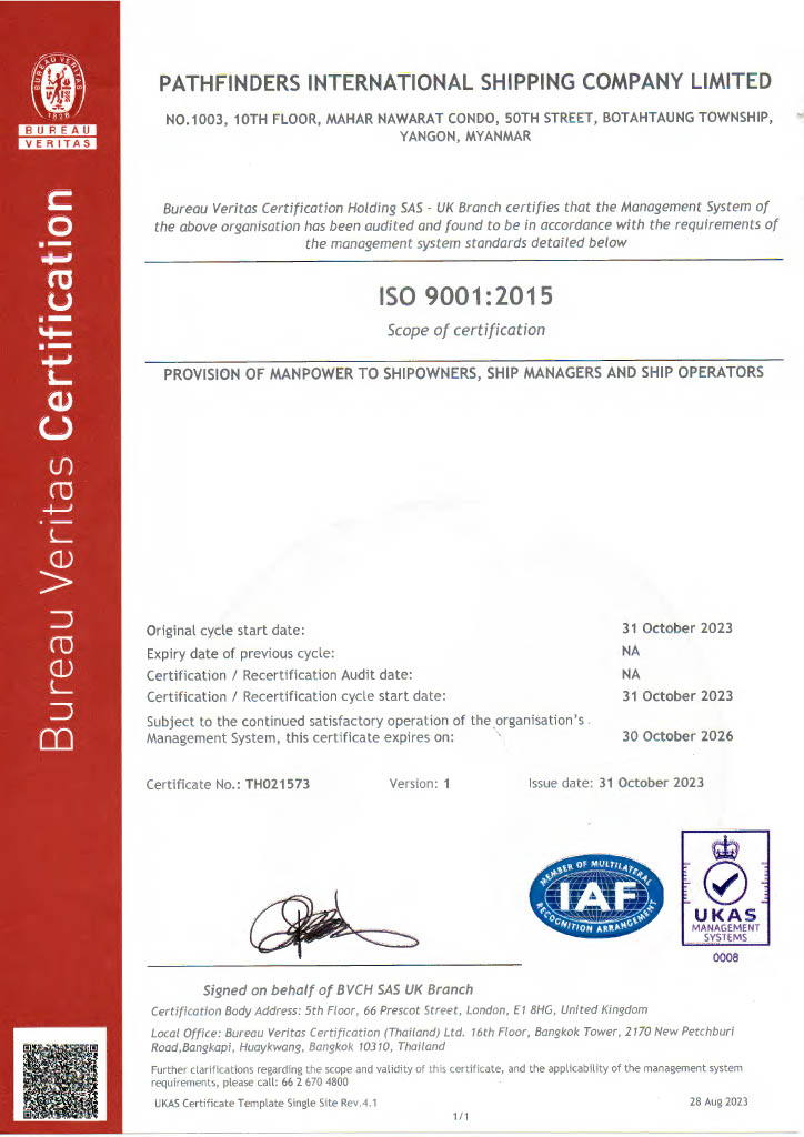 Pathfinders International Shipping Co.,Ltd, is performing as SRPS/PMN/298 from DMA , ISO 9001:2015 from Bureau VERITAS (BV) , Company Registration No: 134483288 from DICA. And our Company is leading & well reputed Ship Manning Agent in Myanmar and planning to build to get more clients related shipping Companies with all over the world. We have started our glorious journey since August 2022 by supplying Myanmar seafarers towards the seas by keeping good performance.